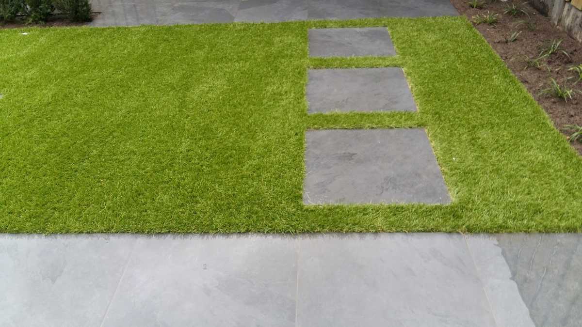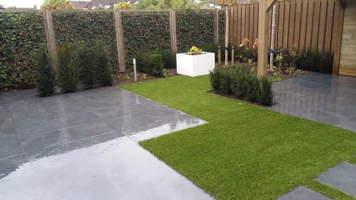 Royalgrass Sense in een achtertuin in Moergestel met staptegels er in.